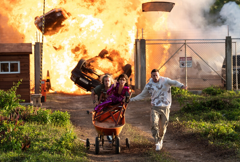紫紅色亮片緊身衣搭配皮靴,在泥濘叢林間狼狽奔逃。57歲的珊卓布拉克依然身形挺拔、狀態極佳,視覺效果十足。這也讓人想起她在電影《地心引力》中飾演太空人的經典橋段——在無重力中蜷縮成胎兒般漂浮,那段肢體語言至今仍令人難忘。
